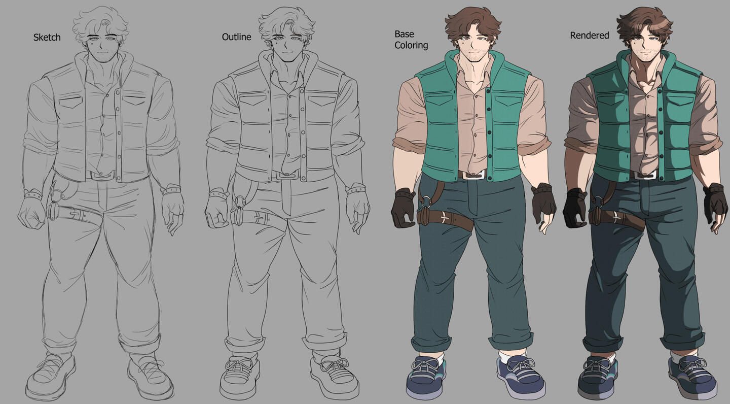 Type | Sketch | Colored sketch | Outline (clean) | Base color | cell shaded | fully shaded |